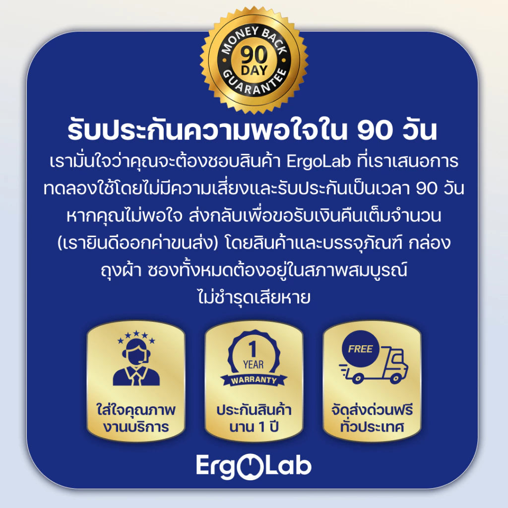 เราต้องการให้คุณเพลิดเพลินกับผลิตภัณฑ์ของเรา โดยมีการรับประกันคืนเงิน 100% ใน 90 วัน หากไม่พอใจสามารถส่งคืนสินค้าเพื่อรับเงินคืนเต็มจำนวน (โดยที่ผลิตภัณฑ์และบรรจุภัณฑ์ไม่ได้รับความเสียหาย) สัมผัสประสบการณ์การสั่งซื้อที่ไร้กังวลกับ ErgoLab